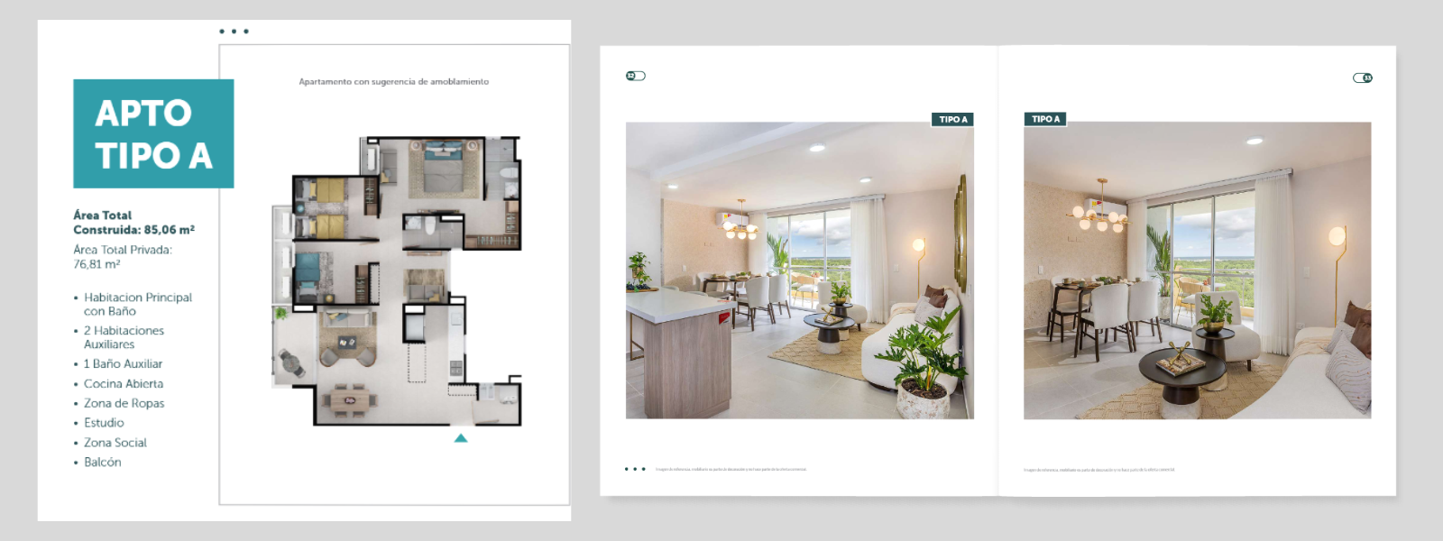 Los apartamentos Tipo A ofrecen amplios espacios con una distribución inteligente que integra sala, comedor y cocina abierta con acabados premium. Su balcón con vista panorámica y ventanales de piso a techo llenan cada ambiente de luz natural y sofisticación.