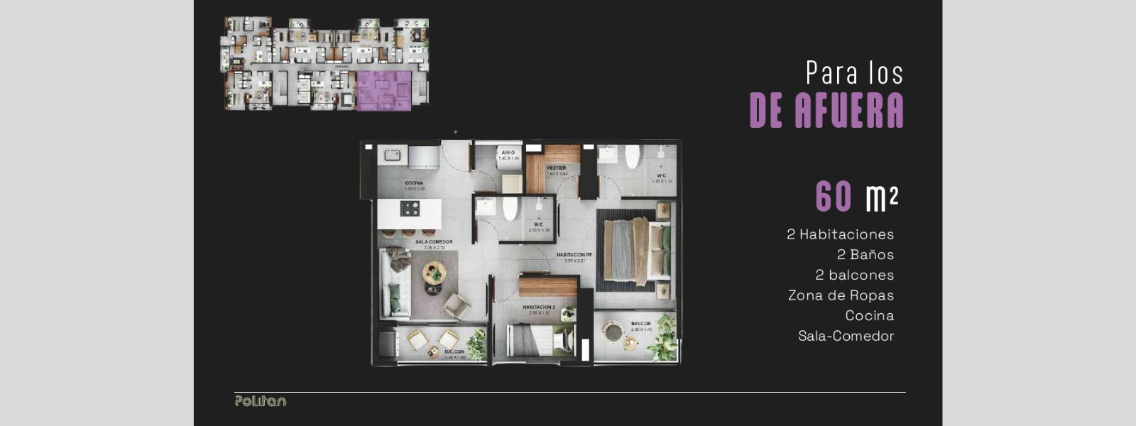 Politan es un innovador proyecto de vivienda y comercio ubicado en el corazón de Sabaneta, concebido como un oasis urbano que integra experiencias modernas y una comunidad vibrante. Desarrollado por Trazos Urbanos, este proyecto de uso mixto combina apartamentos funcionales, locales comerciales y zonas comunes diseñadas para el bienestar, la productividad y la vida en comunidad. Pensado para quienes quienes vienen de afuera y siempre terminan enamorados de la ciudad, por lo que necesitan un lugar para vivir. Pero es importante que cuenten con espacio para la visita de sus familiares, por eso este apartamento es para ti
